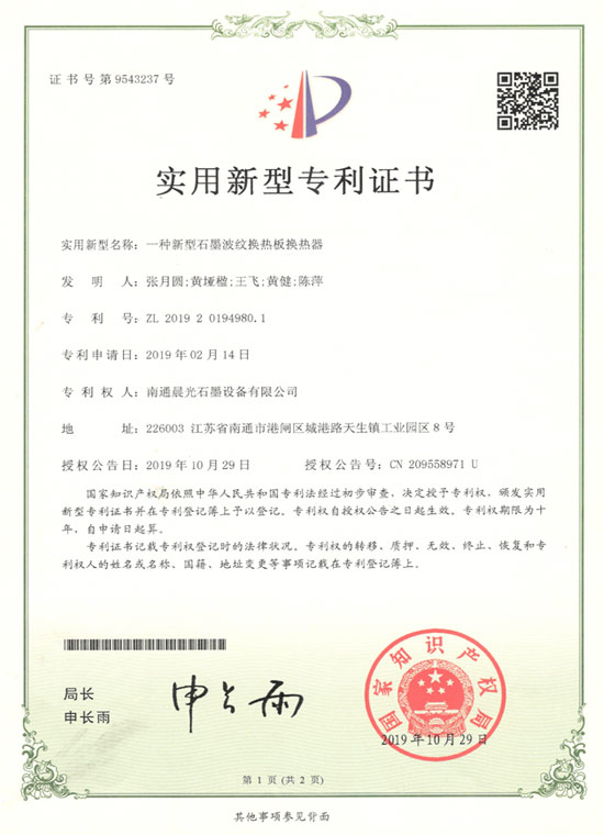 實(shí)用新型專利 :一種新型石墨波紋換熱板換熱器 專利號:ZL 2019 2 0194980.1